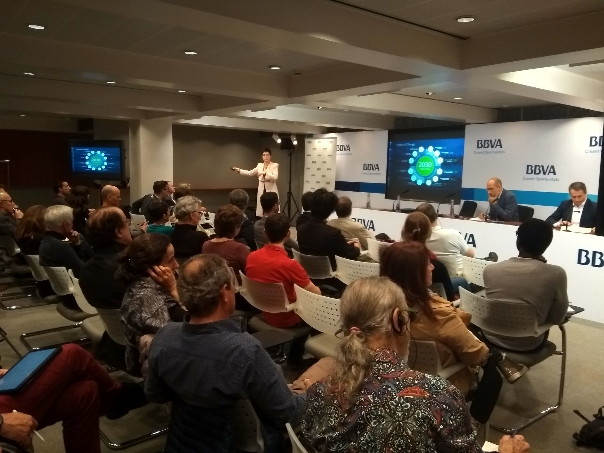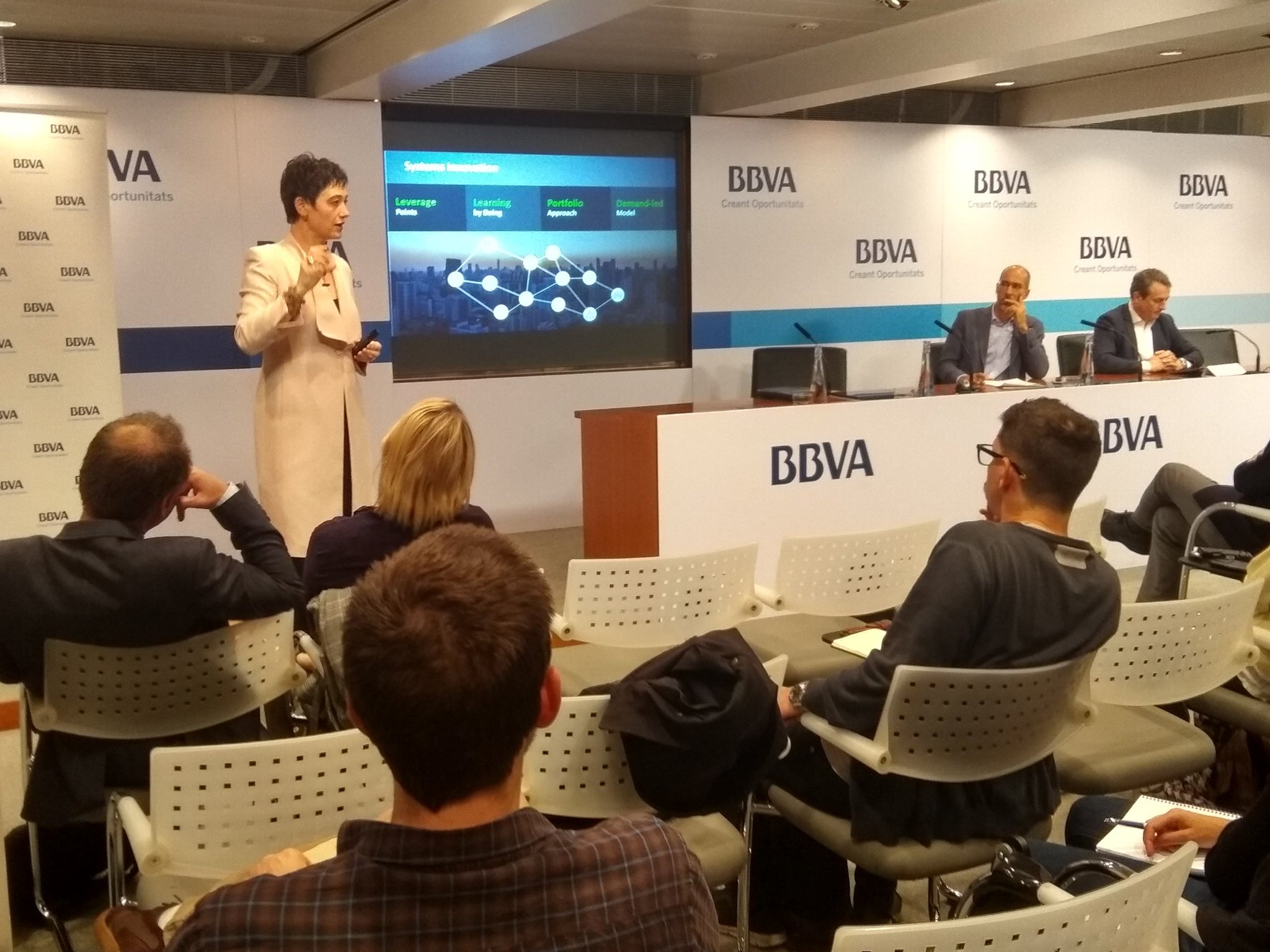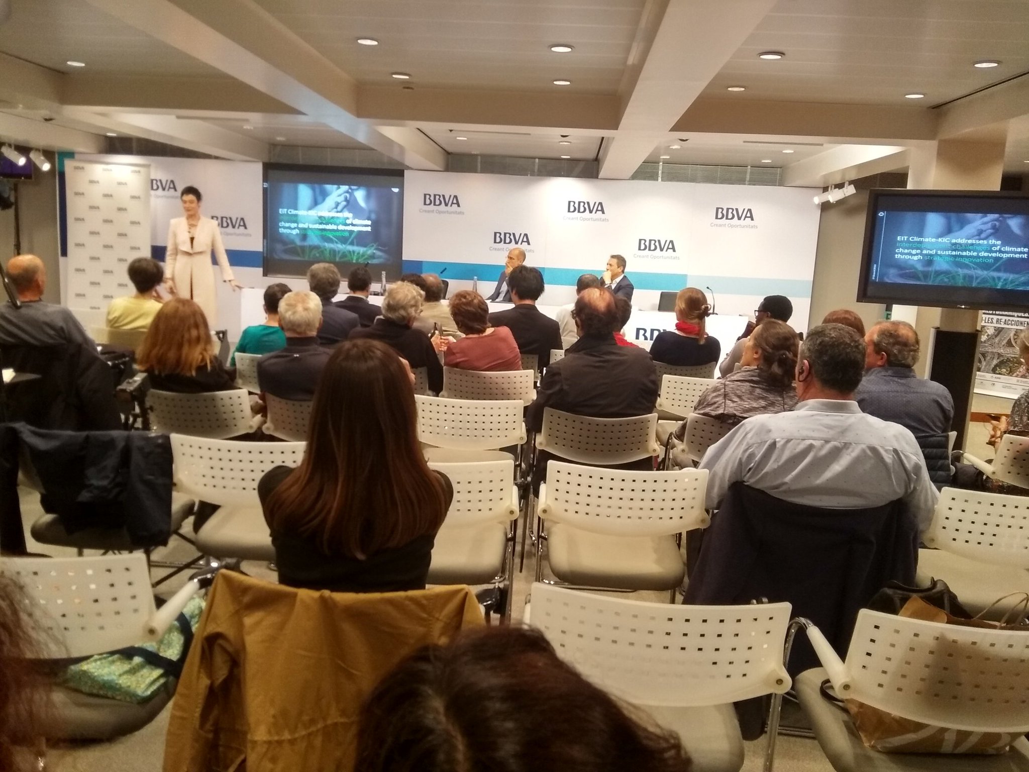 Under the title “Climate innovation: reimagining everything”, the CEO from EIT Climate-KIC (Knowledge and Innovation Community) participated the 20th may in the conference series “Facing Climate Change” from the Re-City platform organized by the Catalunya Europa Foundation with the collaboration of BBVA and the support of the Barcelona City Hall, the Metropolitan Area of Barcelona (AMB) and the Department of "Territori i Sostenibilitat" of the Generalitat de Catalunya. The conference, held in the auditorium of the BBVA headquarters in Barcelona, was chaired by Lorenzo Chelleri, Re-City’s scientific adviser and professor researcher from Universitat Internacional de Catalunya-UIC Barcelona, and as a good host, Antoni Ballabriga, global director of Responsible business from the bank, who was in charge of presenting the guest speaker.